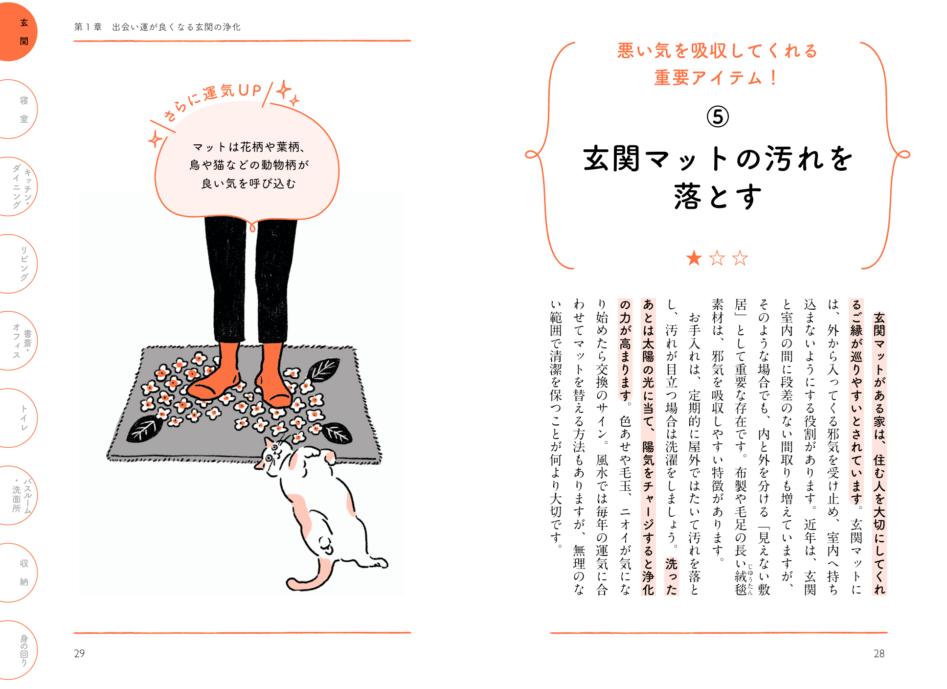 本書は、イラストと分かりやすい文章で構成されています 風水は難しい、掃除をしないといけない、と少し面倒な側面がありますが、ゆうはん流風水は「誰でも簡単に実践できるお手軽さがポイント」です。開運の鍵は、風水のメソッドを実践して「自分を動かせるかどうか」。風水はおまじないのようなものではありません。歴史ある学問、開運技術です。